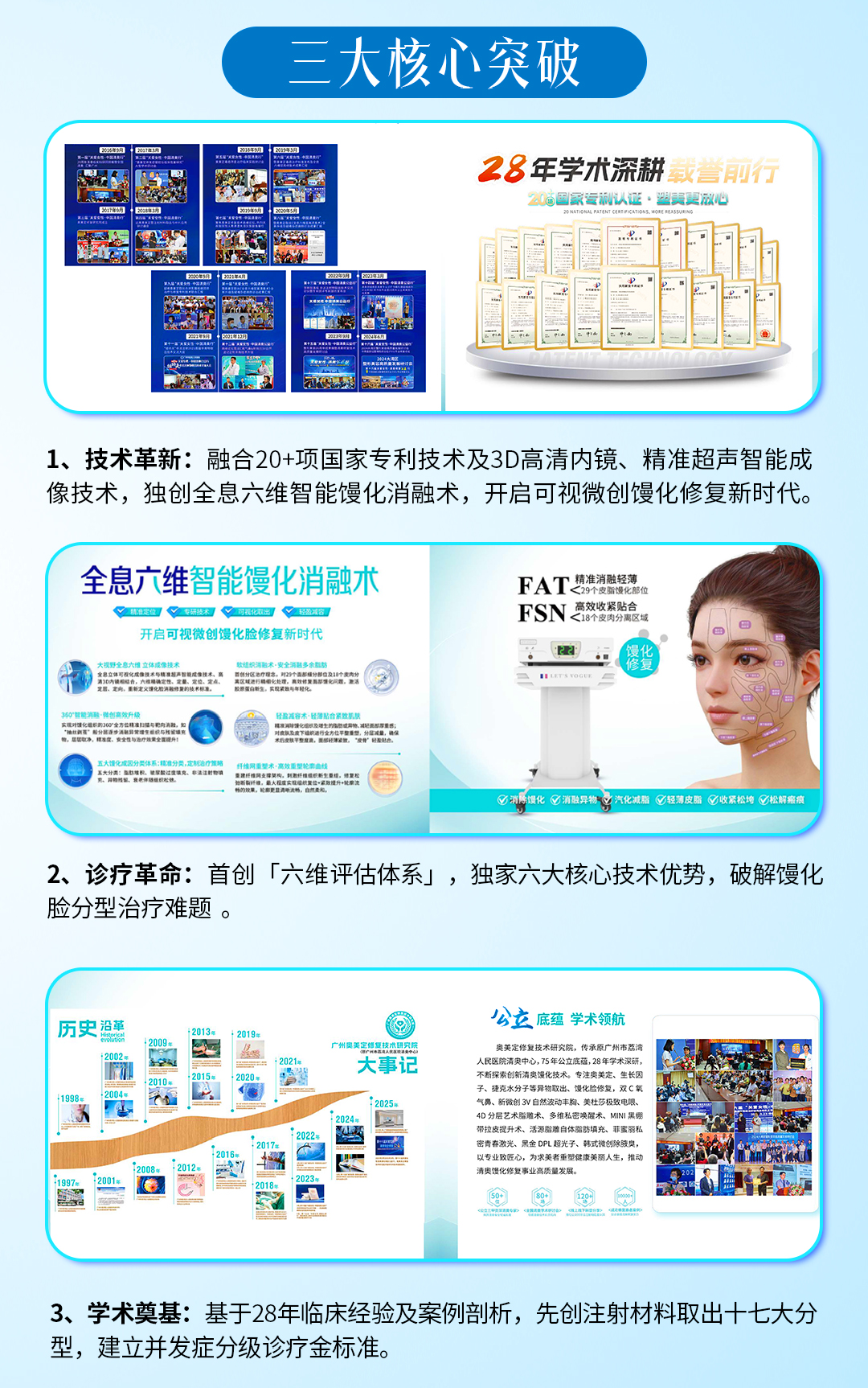 我院凝聚28年清奥馒化修复临床经验,发布行业首部多学科联合诊疗技术标准《清奥馒化修复手册》。通过20余项国家专利技术与前沿影像技术融合,首创“全息六维智能馒化消融术”;建立“六维评估体系”与“非法注射材料取出17类分型”理论,系统破解馒化脸分型诊疗难题,为注射物取出与并发症修复奠定科学标准,推动该领域进入可视、微创、标准化诊疗新阶段。